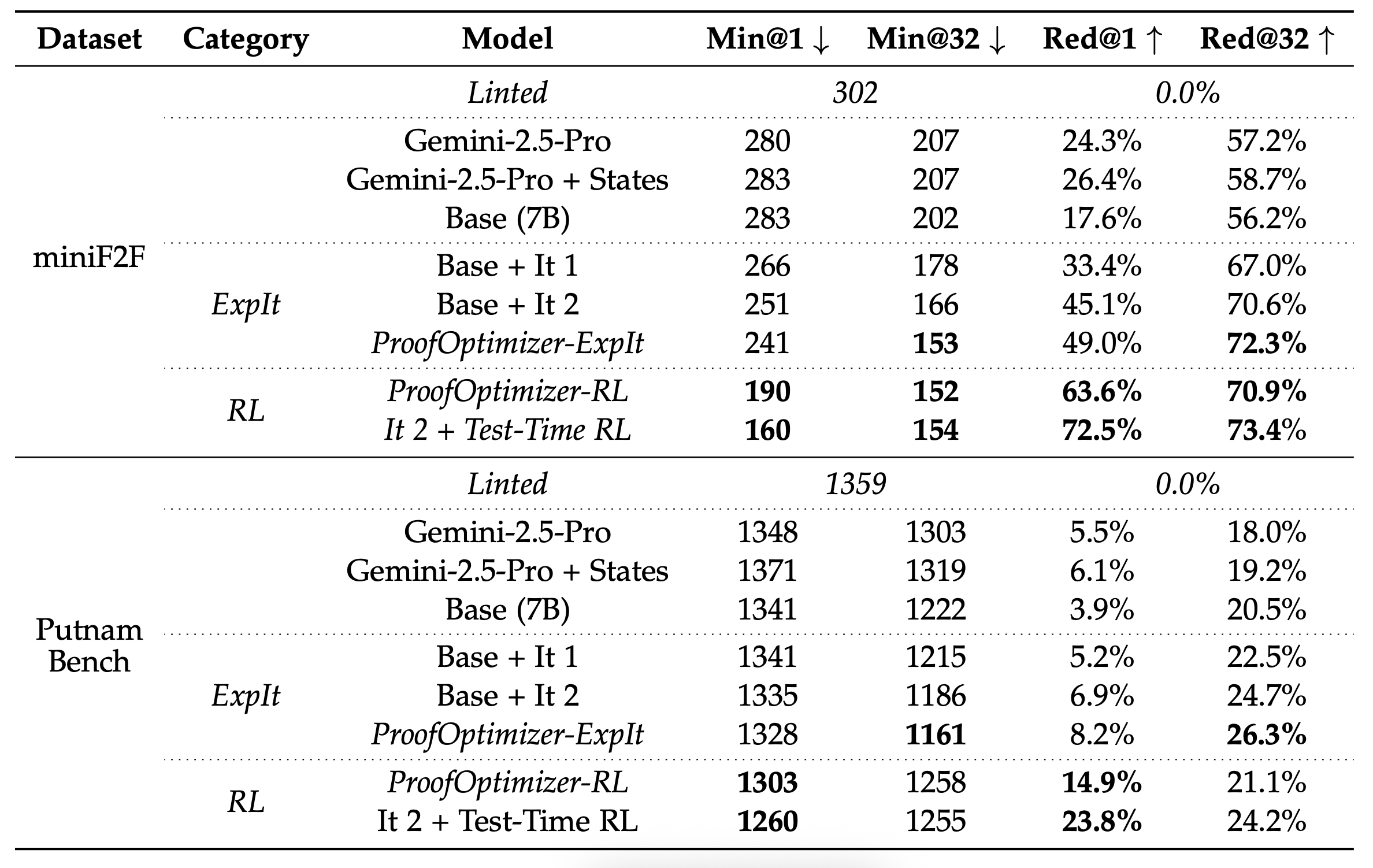 tactic.We compare two training approaches for ProofOptimizer. ProofOptimizer-ExpIt (expert iteration) gradually improves the model by sampling candidate simplifications, verifying them in Lean, and retraining on successful reductions. Across multiple rounds, this process steadily improves both minimum proof length and relative reduction metrics. ProofOptimizer-RL (online RL) runs GRPO with relative reduction in proof length as a reward. RL significantly improves single-sample performance but can reduce diversity, a common effect. Finally, running online RL on the evaluation set at test-time further boosts single-shot performance. Overall, our ProofOptimizer outperforms strong baselines like Gemini-2.5-Pro, achieving substantial proof shortening while maintaining correctness.