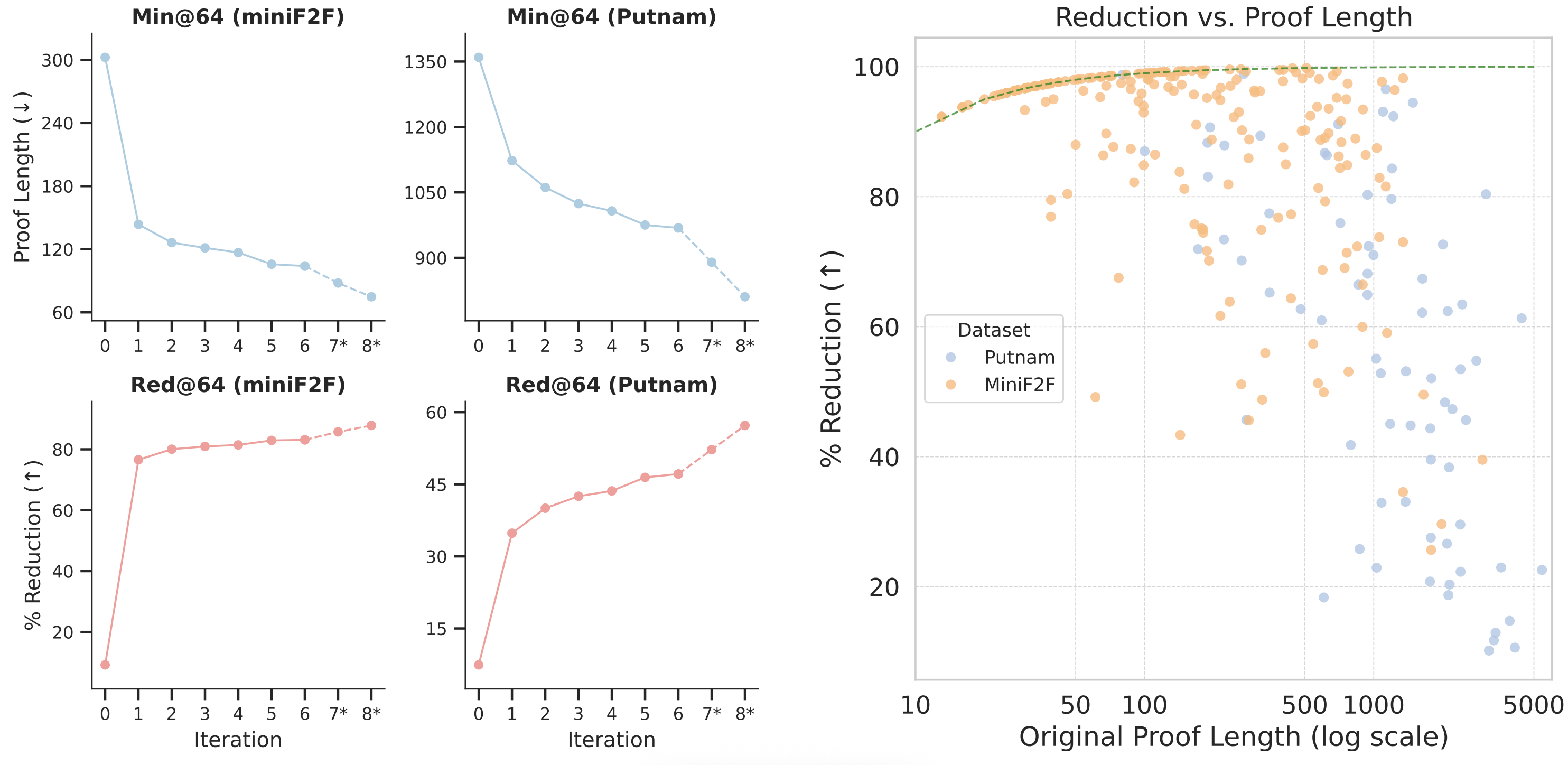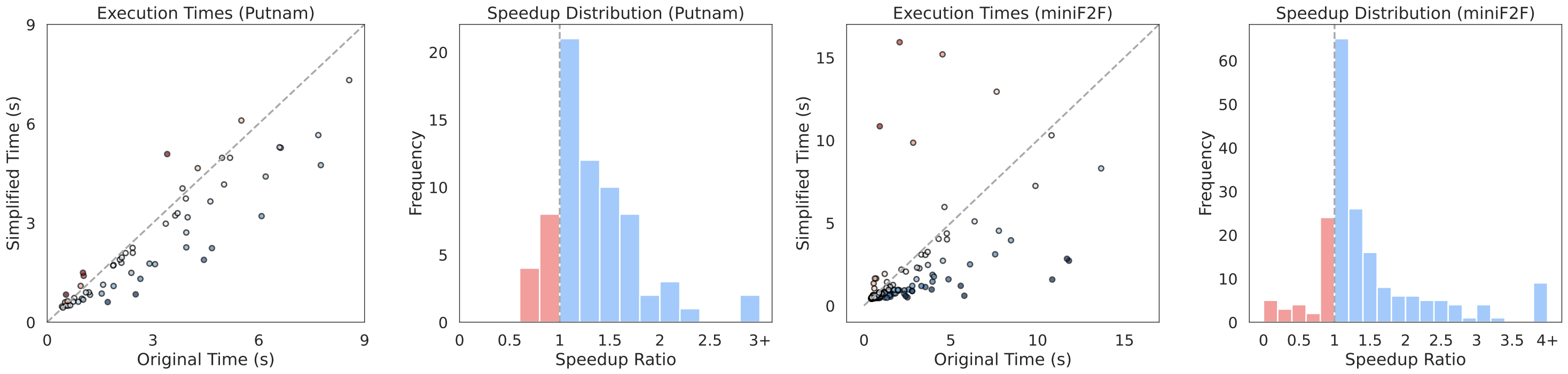 Simplified Proofs Run Faster: Simpler proofs don’t just read better—they often execute faster. Using Lean’s profiling tools, we compared the compilation times of original and simplified proofs. Across MiniF2F and PutnamBench, most simplified proofs ran faster, with roughly two-thirds showing at least a 10% speedup and many exceeding 50%. The improvement was especially large for proofs that were slow to begin with. The gains mainly come from eliminating redundant tactics, though in a few cases, shorter proofs were slower when they replaced efficient strategies with simpler but less optimized reasoning.