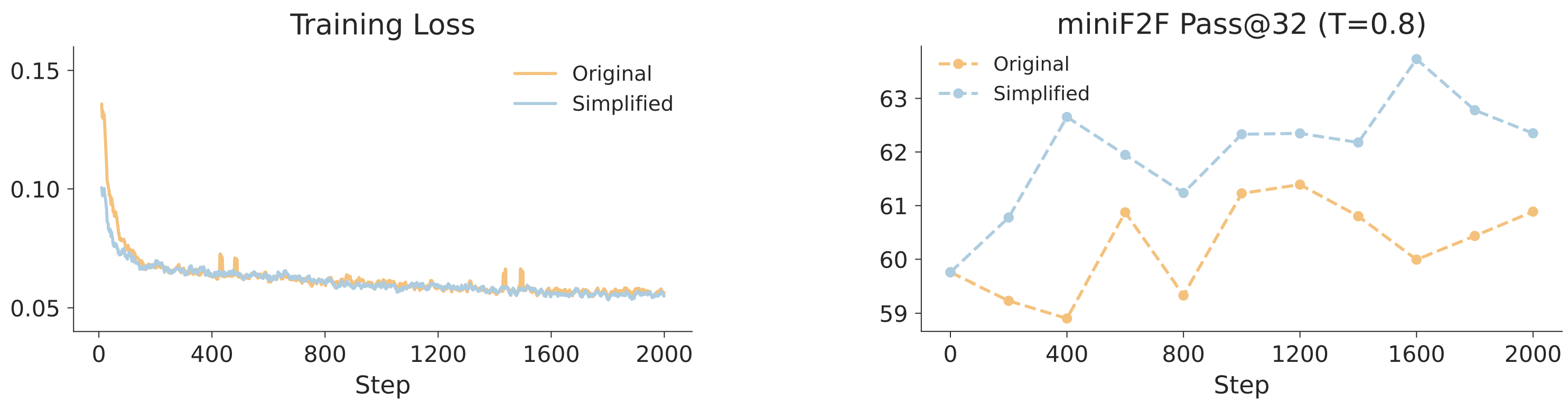 Training on Simplified Proofs Improves Generation: We explored whether training on shorter, cleaner proofs helps models learn more effectively. To test this, we fine-tuned identical models on two datasets: one containing original proofs generated by Goedel-Prover-V2, and another containing the same proofs simplified by ProofOptimizer. The simplified versions were about 40% shorter on average. While both training runs reached similar final losses, models trained on simplified proofs achieved slightly higher accuracy on the MiniF2F benchmark. This suggests that shorter, more structured proofs may provide clearer learning signals and reduce training instability caused by overly long or noisy examples.